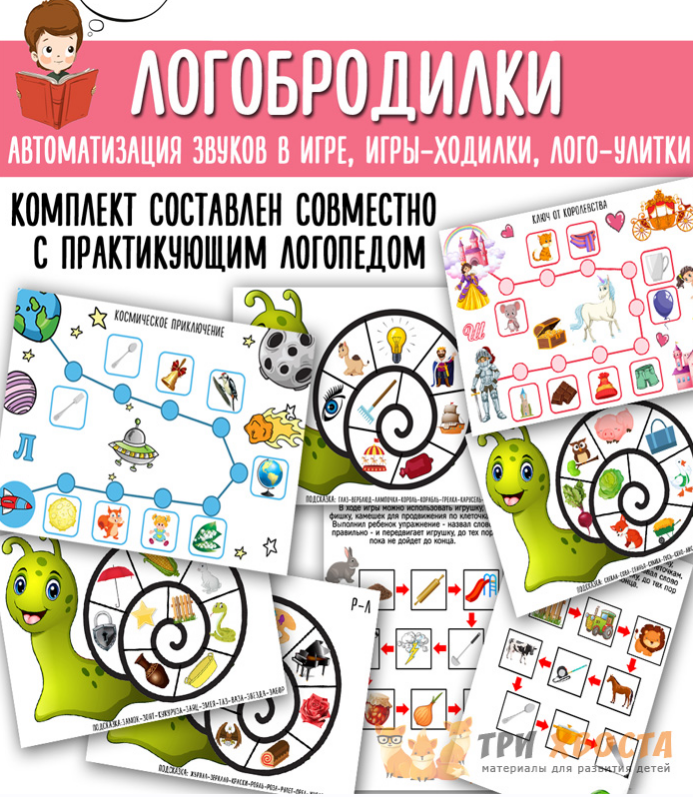 Комплект заданий Логобродилки поможет легко и быстро ввести автоматизируемый звук в самостоятельную речь ребёнка. Разнообразные игровые ситуации позволят автоматизировать звук в слове, обогатить словарный запас, развивать логическое мышление. Вас ждут весёлые лого-улитки, игры-ходилки, логопедические схемы.