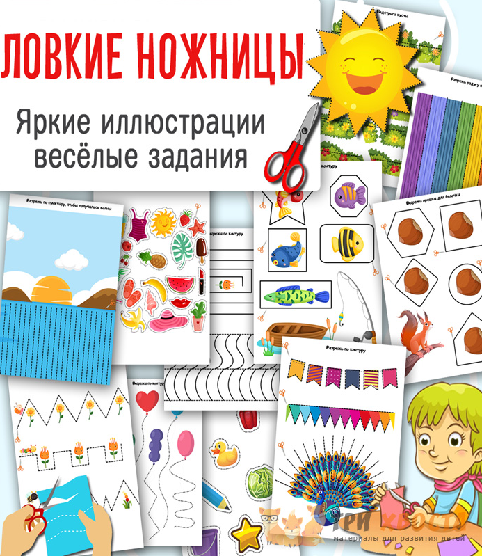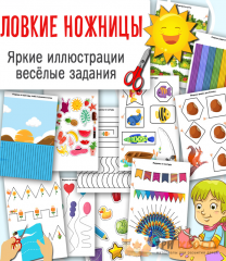 Комплект заданий Ловкие ножницы - новый яркий комплект заданий для освоения работ с ножницами! Вырезание очень полезное занятие, ведь оно предоставляет нагрузку для укрепления пальчиков, что в свою очередь развивает мелкую моторику. Также, выполняя задания этого сборника, улучшается координация движений пальцев, а это способствует образованию новых нейронных связей, т.е. развитию мышления ребенка.