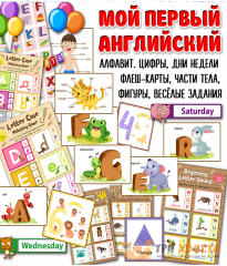 Комплект заданий Мой первый английский учить детей английскому языку по простым практическим заданиям, флеш-картам, фигурам и таблицам. Мы знаем как заинтересовать детей в изучении английского языка и как упростить запоминание лексики! В ярких и удобных иллюстрациях нашего материала детки смогут легко освоить несколько лексических тем, получить большой запас английских слов, которые непременно пригодятся ему в школе!