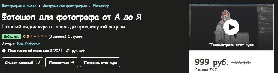 Описание Максимально подробный курс по работе в Фотошопе для фотографов. Содержит всю необходимую информацию для того чтобы начать классно обрабатывать снимки, структурировать знания, закрыть все пробелы и узнать как упростить и автоматизировать многие процессы ретуши изображений. Я преподаю в Международном Институте Фотографии и Кино с 2013 года. За это время я собрал отличный курс по Фотошопу с учётом обратной связи от моих студентов.