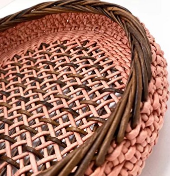 Делать переплетенное круглое (можно и прямоугольное, треугольное, овальное и так далее) воздушное полотно с помощью специального станка. В этом станке и будет вся ценность техники. Такое полотно вы сможете потом использовать не только для дна, но и в крышках для корзин.
