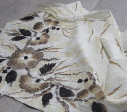 На вебинаре я покажу видеоурок по одному из вариантов декорирования войлока с помощью готового шерстяного платка с принтом и волокон растительного происхождения.