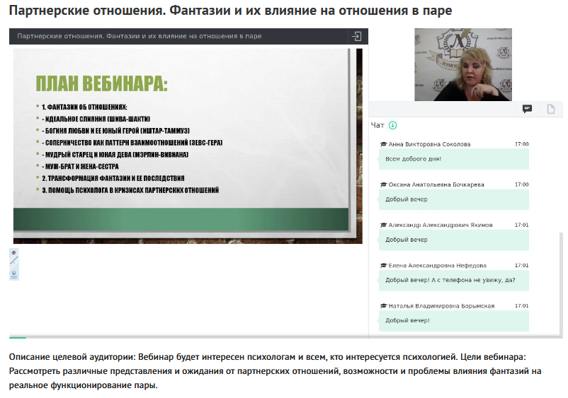 Описание целевой аудитории: Вебинар будет интересен психологам и всем, кто интересуется психологией. Цели вебинара: Рассмотреть различные представления и ожидания от партнерских отношений, возможности и проблемы влияния фантазий на реальное функционирование пары.