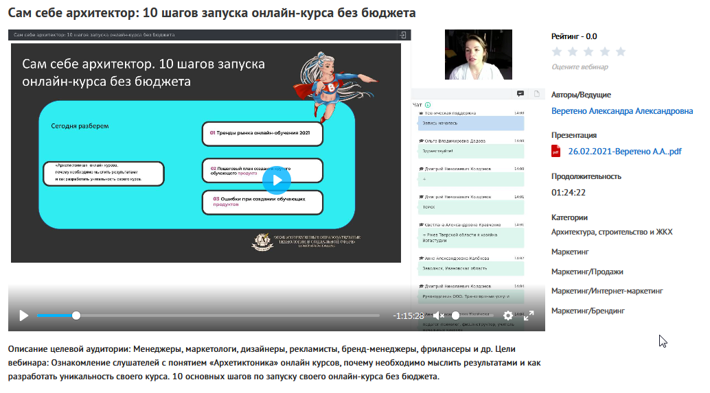 Вебинар ' Сам себе архитектор: 10 шагов запуска онлайн-курса без бюджета' (Александра Веретено)