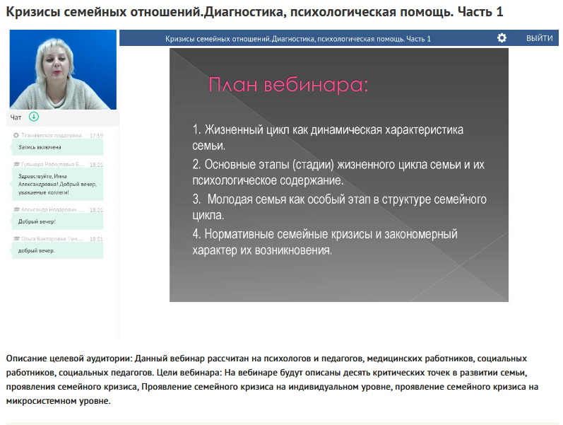 Описание целевой аудитории: Данные вебинары рассчитаны на психологов и педагогов, медицинских работников, социальных работников, социальных педагогов. Цели вебинаров: На вебинарах будут описаны десять критических точек в развитии семьи, проявления семейного кризиса, Проявление семейного кризиса на индивидуальном уровне, проявление семейного кризиса на микросистемном уровне.