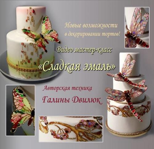 Первый – торт в три яруса с двумя стрекозами и декором из полосы орнамента на нижнем ярусе. Он декорирован с применением авторской технологии быстрой сладкой эмали.
