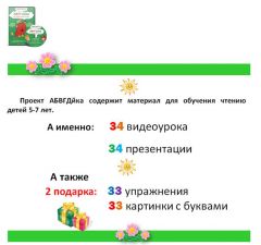 Для изучения нового материала разработаны видеоуроки в соответствии с методикой обучения чтению детей в 1 классе. Все уроки построены начиная со схем слов, которые постепенно заменяются словами с уже изученными буквами и текстами.