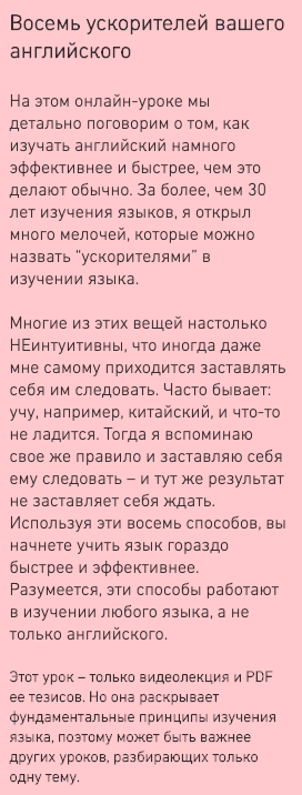 На этом онлайн-уроке мы детально поговорим о том, как изучать английский намного эффективнее и быстрее, чем это делают обычно. За более, чем 30 лет изучения языков, я открыл много мелочей, которые можно назвать “ускорителями” в изучении языка.