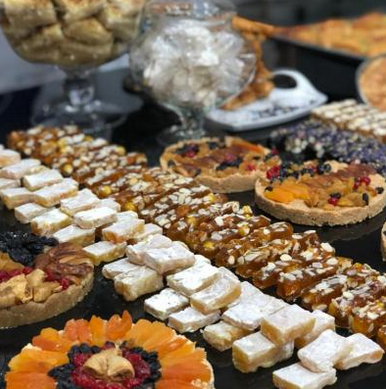 • Большой ассортимент восточных сладостей, от мягких конфет до сухой выпечки.