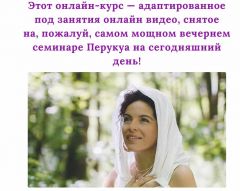 Уникальность этого 3-х часового онлайн семинара в том, что он сочетает авторские практики Перукуа с ее «новым», в чем-то исцеляющим голосом, которым она вживую исполняет запредельные, можно сказать, «невозможные» для человека звуковые палитры (идеально делать этот онлайн семинар в хороших наушниках), погружаясь в которые вы испытаете глубочайшие переживания, откроетесь и почувствуете зов и сияние своей Души!