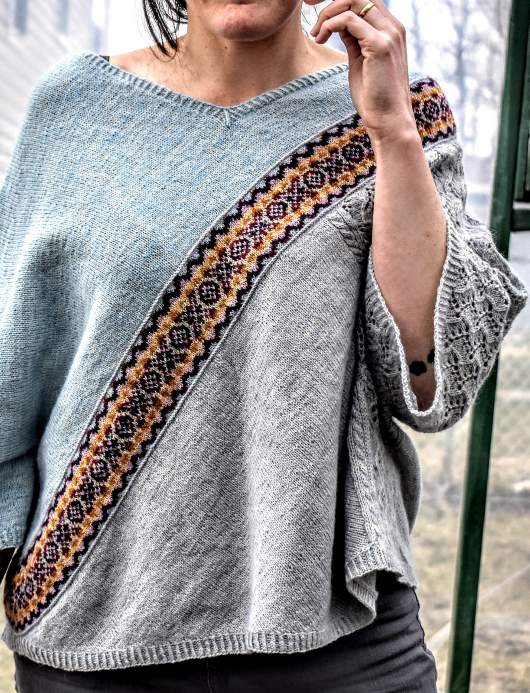 В Атлантический Канаде Барашуа – это лагуна, отделенная от океана галькой или скалой (песчаная полоса редкость для этих мест!). Барашуа послужила источником вдохновения для джемпера Barachois свободного кроя в стиле пончо. Сначала выполняется полоса жаккарда по кругу. Затем петли поднять с обеих сторон этой полосы и продолжать в разных направлениях лицевой гладью и ажурным узором.