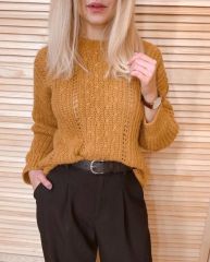 Изделие вяжется поперек. Состоит из отдельных деталей: передняя полочка, задняя полочка и рукава. Спинка с ростком, немного удлиненная. Рукав прямой, с удлиненными манжетами. Спущенное плечо. Джемпер сшивной. ??