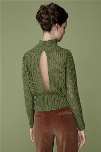 Женский джемпер с открытой спиной рыхлым узором - сетка и высокой планкой по талии, воротом и манжетами, вязаными резинкой.