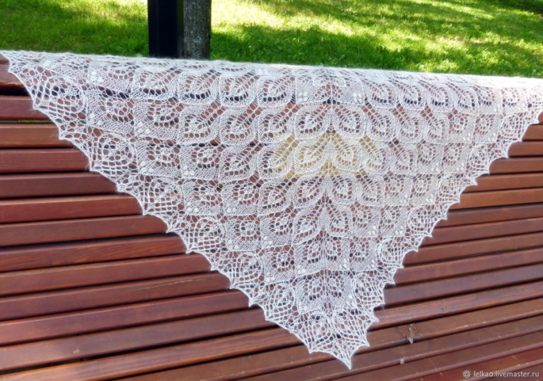 Шаль классической треугольной формы. Уровень сложности - средний. Подробное описание и схемы в формате pdf.