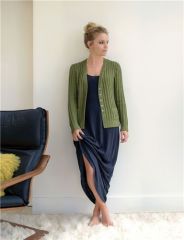Кардиган связан из ленточной пряжи Cotton Lustre от компании Rowan. Это 100% хлопок, который успешно себя раскрывает в различных узорах, будь то ажур, или как в данном случае узор со снятыми петлями. Всего на кардиган потребуется 14 (15, 15, 16, 16, 17) мотков по 50 грамм зеленого цвета Grass.