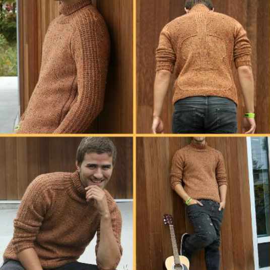 Мужской пуловер Adagio вяжется спицами снизу вверх. Спинка пуловера , связанная косами, узором «рис» и снятыми петлями, образует силуэт гитары. Линии реглана и погоны на плечах обрамляют мелодию этой оригинальной модели.