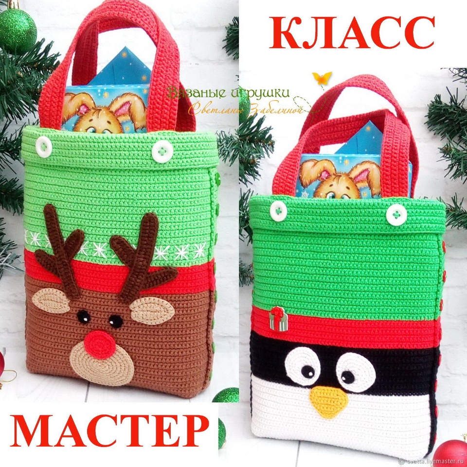Предлагаю мастер-класс по вязаным крючком сумочкам для новогодних подарков с декором в виде мордочек Оленя и Пингвина.
