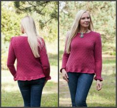 Последнее, восьмое описание предстоящей осенней коллекции 'Загадки Альпаки'- джемпер Cranberry ('Клюква'). В конструкцию джемпера входят два вида вытачек для груди, незаметные на первый взгляд. Боковые вытачки, удлиняющие перед, спрятаны между раппортами узора; скрытая вертикальная, убирающая допущенную ширину для переда, выполнена с использованием убавления в раппортах узора. Украшающие детали – рукава-фонарики и рюши – также являются неотъемлемой частью узора и становятся приятной находкой в процессе вязания.