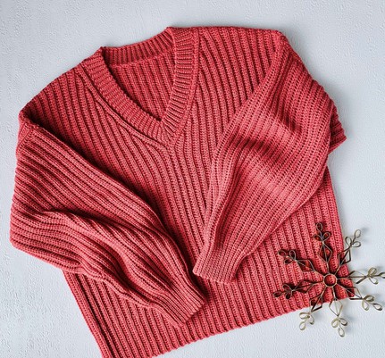 Пуловер оверсайз, прямого покроя со спущенным плечом, с широким рукавом и V- образной горловиной. Ширину пуловера и рукава можно регулировать на свой выбор и сделать уже.
