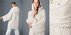 Очень свободный пуловер, связанный в разных направлениях различными косами и рельефными узорами из лицевых и изнаночных петель, с роскошным капюшоном.