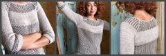 Дизайнер Бристол Иви хотела посмотреть, можно ли создать графические перекрестки полос, при этом формируя пуловер. И вот, кокетка частично формируется укороченными рядами, а частично вяжется типичным регланом. И корпус выполнен комбинацией укороченных рядов и чистой лицевой глади.