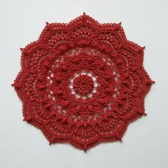 Расход нити, размер крючка, размер готового изделия будет зависеть от Вашей плотности вязания. При использовании рекомендуемых материалов, на эту схему уходит около 240-260 м нити, и размер готового изделия выходит около 32 см в диаметре по крайним пико.