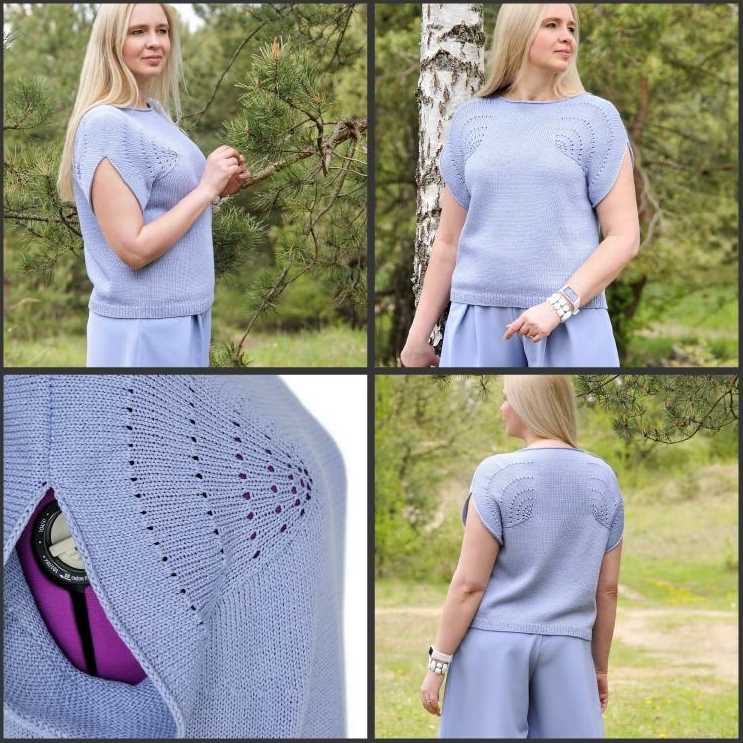 Топ бесшовный, связан по направлению из центра к краям и использует всего лишь три отрывные нити. Одна — для кокетки переда, вторая — для кокетки спинки и всей оставшейся кокетки по кругу, и третья — для корпуса. В изделиях сложной конструкции очень непросто внедрить приемы для улучшения посадки, но в этот раз дизайн сам подсказал, где и что должно быть, и как это сделать. Горизонтальные вытачки для груди в виде клиньев, вертикальные вытачки в виде сборки, удлиненная верхняя часть спинки, перед шире спинки на уровне груди, расширение нижней части спинки.