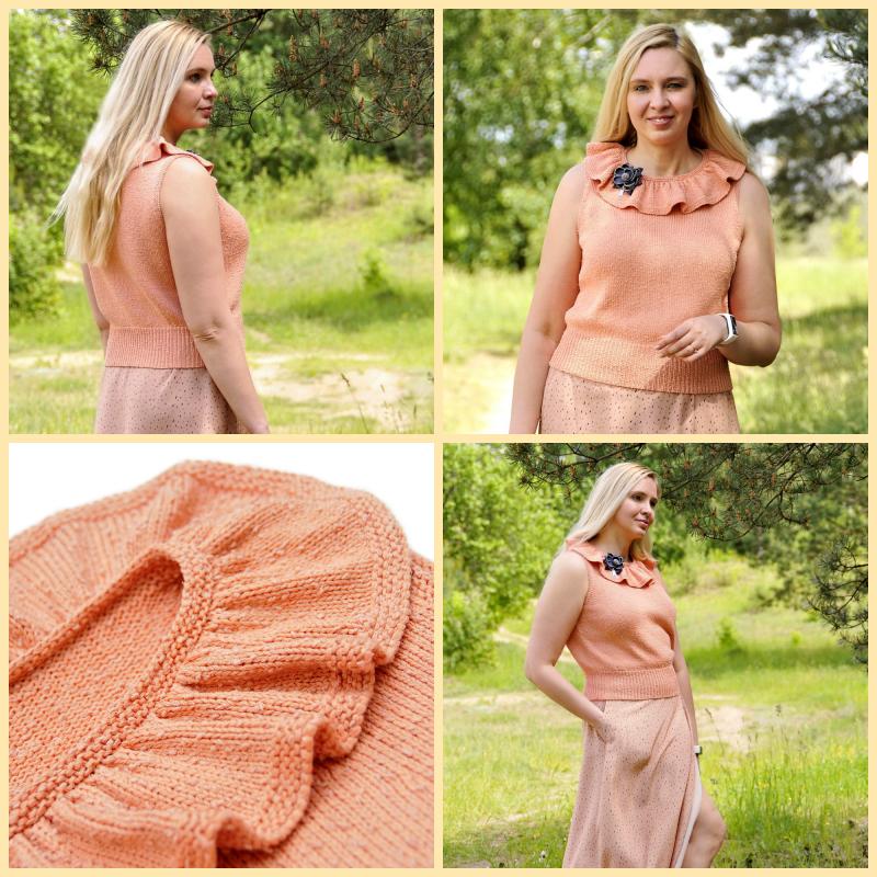 Зарю здесь воплощает основная украшающая деталь летнего топа – оборка горловины. Эта винтажная деталь выполнена современными вязальными технологиями без единого шва.
