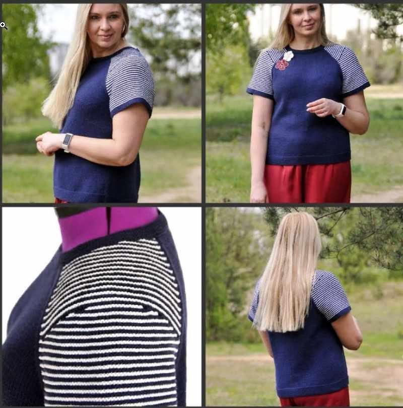 В августе звезды светят особенно ярко, и именно это время – лучшее, чтобы любоваться красотой вселенной и задумываться о бесконечности. Иногда необъятное становится осязаемым в виде идеи для обыкновенного летнего топа: белое на темно-синем, направление и точность. Широкие короткие рукава с двумя видами плечевых вытачек, выполнены в полоску, создают контраст темному корпусу. Темный кант и мелкий полосатый рисунок намекают на спортивный стиль и хорошо перекликаются со свободным и только слегка приталенным силуэтом.