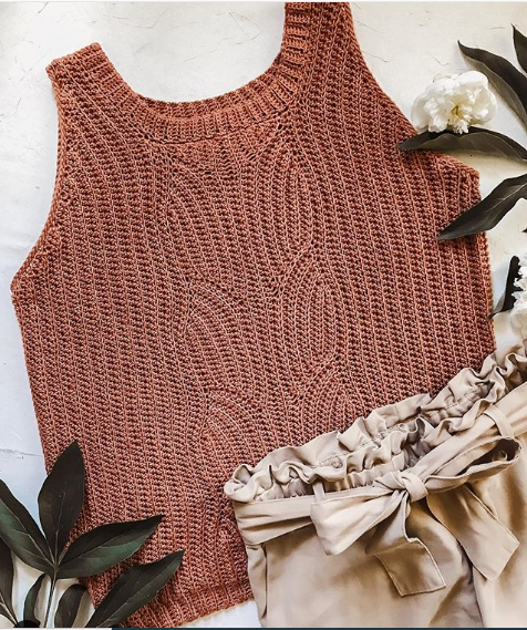 Топ связан крючком. Дан подробный алгоритм расчетов и инструкция по вязанию. Топ вяжется поперёк, начиная сбоку. Состоит из двух отдельных деталей, которые потом между собой сшиваются.