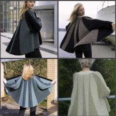 Уникальный вязаный жакет Балерина выполняется платочной вязкой единым полотном прямыми и обратными рядами по вертикали. Работа начинается от левой передней стороны, затем вяжется левый рукав, далее – спинка, правый рукав и затем правая сторона. Расклешенный силуэт формируется укороченными рядами в однотонных полосах. В конце выполняется отделка полочек с горловиной единой планкой.