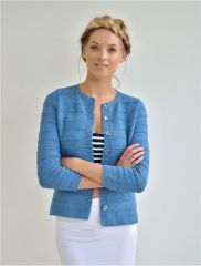 Фаворитом летней коллекции Ким Харгривз Echoes стал женский кардиган классичесвого фасона, связанный простыми, но эффектными полосками лицевой и изнаночной глади. При переходе от одной вязки к другой выполняется рубчик платочной вязки. Вот так Ким, описарясь на простые узоры вязания спицами, выдала нам эффектный модный женский кардиган.