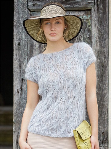 Вязание топа выполняется из пря¬жи Kidsilk Haze (кид мохер и шелк) и Fine Lace (альпака и шерсть) с ажурной полочкой и спинкой гладью.