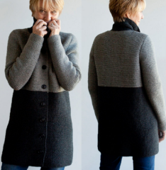 Пальто Brooklyn выполнено сверху платочной вязкой из контрастных цветных блоков и слегка расширяется внизу. Цвет нижней части пальто, которая начинается немного выше линии талии, повторяется на уютном отложном воротнике, который застегивается на пуговицу. Рукава связаны отдельно сверху вниз и затем вшиты в проймы.