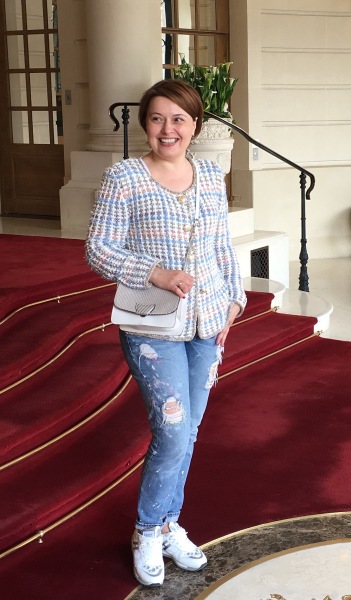 Уровень мастерства: многоцветное вязание, снятые петли, тамбурная строчка, круглый кант, прорезные петли, выполнение жгутов, шлица рукава.