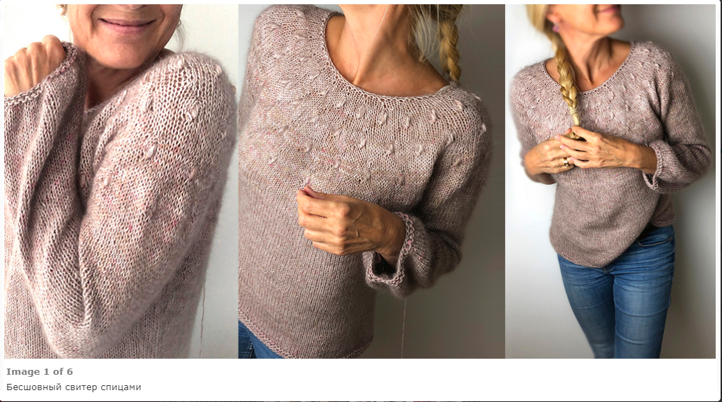 Этот свитер вяжется спицами сверху вниз. Круглая кокетка щедро украшена деликатными шишечками. Они очень органично вписываются в стиль данного свитера.