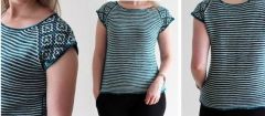 Топ вяжется платочной вязкой из тонкой пряжи в двух цветах. Гармонично сочетающиеся узоры делают работу увлекательной и интересной.