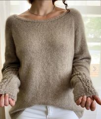 Блузка Juanita - это классический пуловер реглан с вырезом в форме полу-лодочки. Он выполнен лицевой гладью сверху вниз, ажурный мотив выполняется на корпусе и продолжается на рукавах. Пуловер вяжется сверху вниз от горловины, с формированием ростка немецкими короткими рядами.