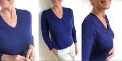 Этот пуловер вяжется сверху вниз по кругу, начинаясь с планки горловины. Формирование как в круглой горловине, соединенное с глубокой V-образной горловиной делает этот пуловер необычным и в то же время таким привлекательным. После формирования кокетки рукава отделяются и вяжется тело по кругу вниз. Варианты формирования тела позволят вам посадить этот пуловер точно на свою фигуру. Рукава также вяжутся по кругу сверху вниз до манжета.