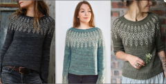 Начинаясь от горловины, этот пуловер вяжется без швов, сверху вниз. Укороченными рядами формируется вырез горловины и росток, затем вяжется жаккардовая кокетка. Есть инструкции и схемы для двухцветной и трехцветной кокетки. После кокетки работа разделяется на тело и рукава, которые вяжутся круговыми рядами.