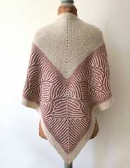 Это треугольная шаль, которая начинается с одноцветного платочного язычка, в верхней части горловины, прибавляя петли по сторонам и в середине по всей её ширине. А второй цвет добавляется для двухцветной полосы платочного вязания, которая переходи в двухцветную бриошь. Двухцветная бриошь переходит в спиральный узор, который формируется путём убавок и прибавок 4 петель. После завершения спирального узора, возвращаемся к двухцветной бриоши, двухцветной полосе платочным вязанием и заканчивается одноцветным платочным вязанием.
