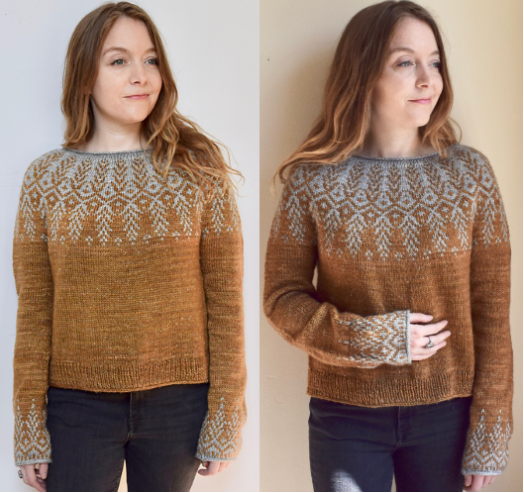 Вязаный свитер Goldwing выполняется без швов сверху вниз с вариантами горловины резинкой или закручивающимся краем. Добавляют укороченные ряды для формирования горловины и провязывают цветной узор кокетки. Рукава отделяют от тела, вяжут по кругу, и заканчивают цветным узором на манжете и шнуром i-cord.