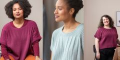 Двухсторонняя текстурная футболка от дизайнера Emily Greene вяжется спицами по кругу от нижнего края до проймы, укороченные ряды делают более утонченной посадку по плечам, в то время как структура укрепляется за счет соединения методом трех спиц.