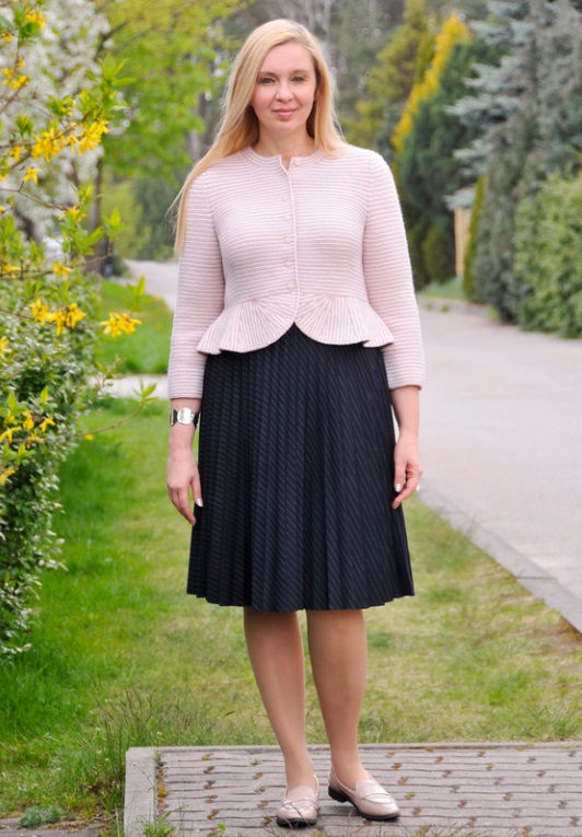 Вязаный укороченный жакет с эффектной баской и приподнятой линией талии – силуэт, благодаря которому ваши ноги выглядят еще длиннее. Сочетайте жакет с пышным низом: расклешенной юбкой или широкими брюками. Этот маленький жакет наполнен множеством элементов дизайна и разными техниками вязания: диагональными вытачками для груди, японским плечом, асимметричной проймой и окатом рукава. Прямые рукава длиной 3/4 делают внешний вид еще более воздушным и кокетливым.
