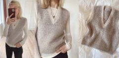 Этот жилет вяжется спицами по кругу сверху вниз. Работа начинается со спины, затем вяжутся части переда, в завершение все детали соединяют в круг и вяжут до нижней кромки прерывистой резинкой. Широкий вырез горловины корректируется планкой, а рукава завершены кромкой резинкой.