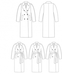 Пальто женское прямого силуэта длиной до середины голени. Застежка смещенная на два ряда петель/пуговиц. Воротник пиджачного типа с цельнокроеной стойкой. Нагрудная вытачка под лацканом. Боковые карманы прорезные с наклонной листочкой – основные по модели. Упрощенный вариант карманов – накладные (есть в основном комплекте лекал). Рукав объемный, построен на базе цельнокроеного рукава — линия плеча мягкая, с плавным переходом плечевого ската к окату. Такая конструкция рукава позволяет выбрать любой вариант членения: 1- полуреглан, 2- классический реглан, 3- цельнокроеный рукав с отрезной нижней частью и ластовицей.