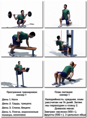 • эффективные планы питания, с конкретными примерами дневного меню, которые в совокупности с верными тренировочными комплексами, позволят максимально быстро снижать жировую прослойку и набрать мышечную массу.