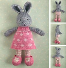 файл PDF, который содержит полные инструкции по вязанию и отделке маленького хлопкового кролика с полосатыми колготками, туфлями Мэри-Джейн и платьем в горошек. Платье можно снять, но колготки / чулки и туфли связаны как часть кролика.