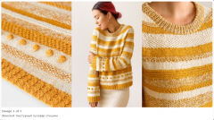 И корпус, и рукава вяжутся снизу вверх без формообразования. Верх свитера выполнен в виде круглой кокетки. Горловина и росток формируется с помощью коротких рядов. Эта часть пуловера вяжется прямым рядами. Корпус состоит из последовательности полосок различными узорами. Вы можете прибавить/убавить длину вашего пуловера, повторяя / пропуская некоторые из этих полос. Каждая полоса вяжется нитью в два сложения: цА, цВ, или цА+цВ.