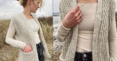 вяжется сверху вниз, узором бриошь. Сначала двойной вязкой вяжется секция горловины спинки, которая позже будет соединена с полочками. Затем, вдоль одной стороны этой секции поднимаются петли и из этих петель вяжется кокетка спинки. После этого вяжется правое и левое плечи. Эти три секции соединяются в подрезах, и тело вяжется прямыми рядами, узором бриошь с планками полочек двойной вязкой. Затем вокруг пройм поднимаются петли и края пройм так же вяжутся двойной вязкой. Карманы также вяжутся узором бриошь и пришиваются в самом конце.